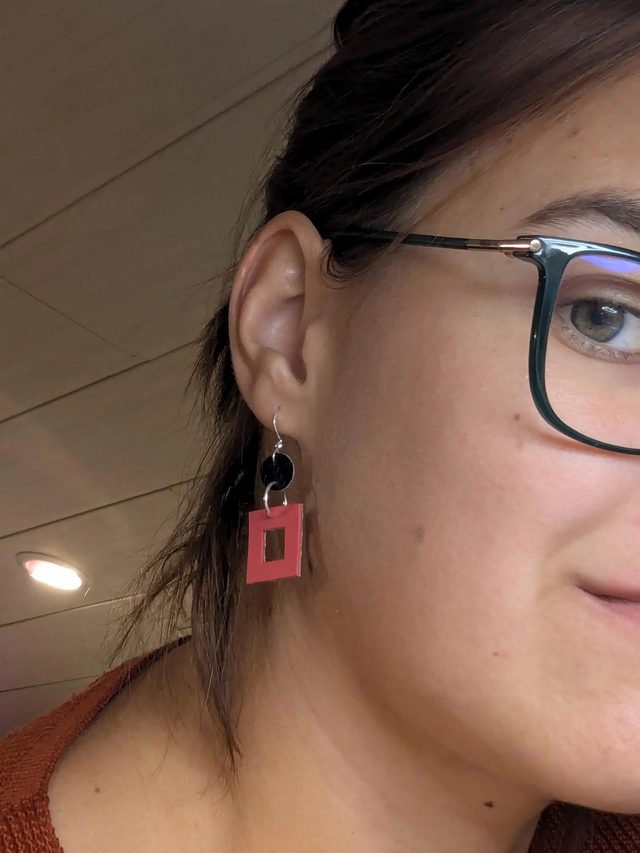 Boucles d'oreilles en similicuir rose légèrement texturé, et noir effet tressage, de forme géométrique carré et rond.